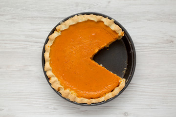 Homemade Thanksgiving pumpkin pie on a white wooden background, overhead view. Top view, from above, flat lay.