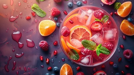 Bright vector image of a fruit punch bowl with ladle and floating fruit slices.