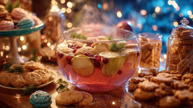 Festive punch bowl surrounded by cookies and holiday treats,