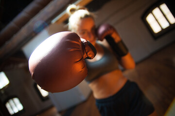 Business woman boxing punching towards camera ready to fight. Strength, power or competition concept image of beautiful strong businesswoman