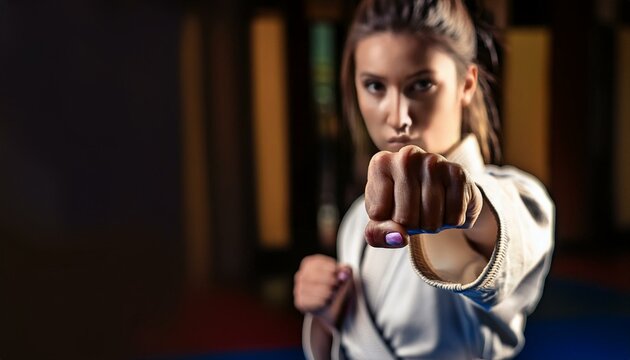 A martial artist in a punching pose facing the camera; selective focus; blurred background; a karate or tae kwon do martial artist with their fist in focus; sports photography