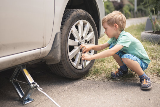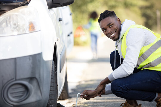 Car wheel low air pressure. Auto repair tires. Car with punctured car tire on a road. Focus on a wheel. Forced emergency stop on the side of roadside, burst tire, insured event.
