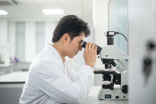 Scientist analyze biochemical samples in advanced scientific laboratory. Medical professional use microscope look microbiological developmental of viral. Biotechnology research in science lab.