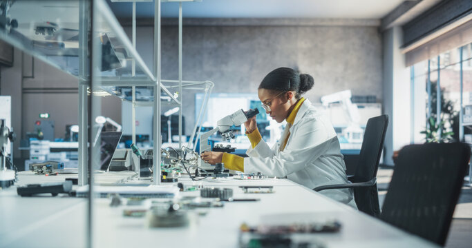 College Science Classroom: Diverse Multiethnic Group of Students Experimenting with Computer Components, Soldering Circuit Boards, Using Microscopes. Teacher Walking and Observing the Experiment