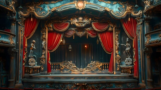 Antique Puppet Theater with Ornate Stage and Hand Carved Marionettes Vintage Aesthetics Concept with Copy Space