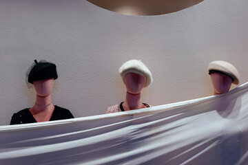 Three puppet dolls hiding under the scenes during the performance in puppet theater. Two puppet men with beard and in typical Asian clothing