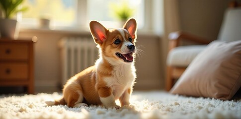 Playful corgi pup sitting inside a cozy room, gazing curiously, sitting, puppy, dog