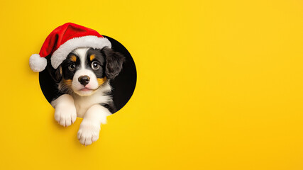Fluffy puppy with Santa hat looks out with big eyes.