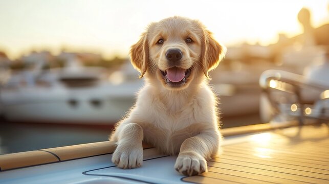 Golden retriever puppy luxury yacht deck playful mood bright sunny background hyper detailed photo