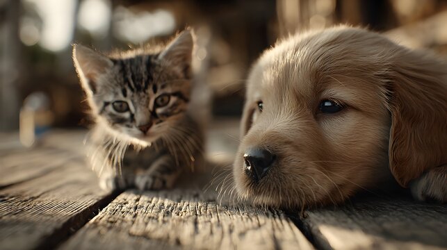 Cute golden retriever puppy sitting on wooden deck with curious expression