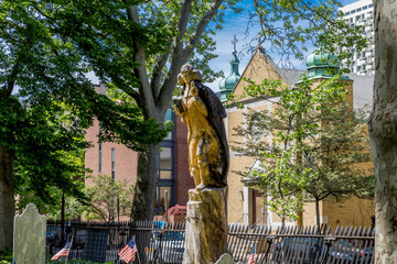 Historic Quaker preacher carved into a tree.  Carving overlooks historic cemetery in Old City Philadelphia.