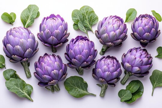 Fresh purple artichokes and green leaves arranged flat on white background