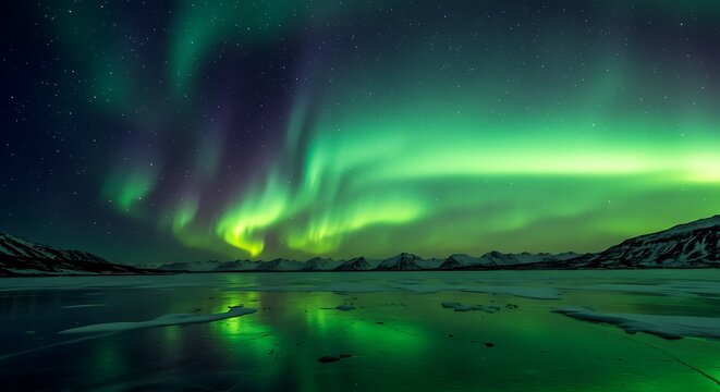 Glowing northern lights stretching across frozen lake, green aurora reflecting on smooth ice