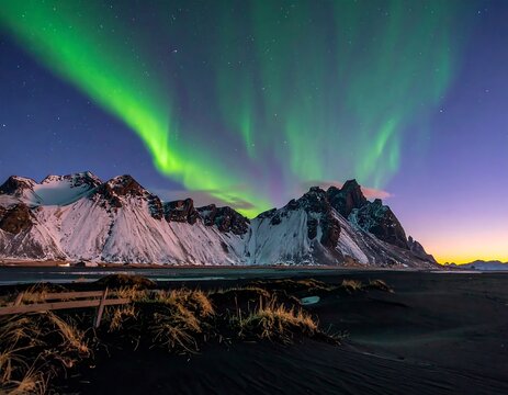 Spectacular green and purple aurora borealis over snowy mountains