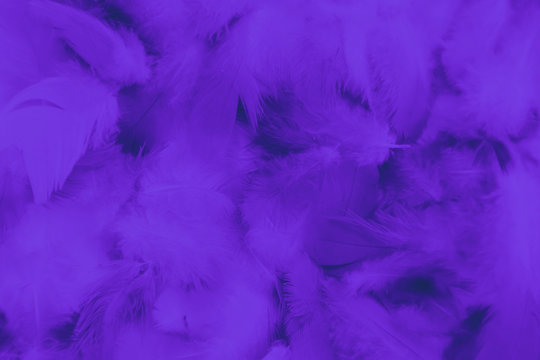 Beautiful abstract purple feathers on dark background and soft white pink feather texture on dark pattern and light blue background, colorful feather, purple banners