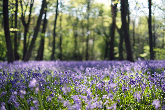 Beautiful woodland bluebell forest in spring. Purple and pink flowers under tree canopys with sunrise at dawn