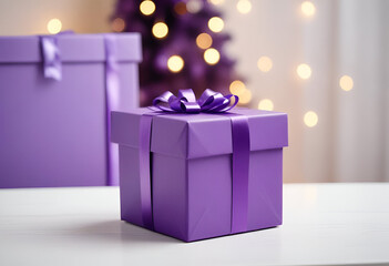 A purple gift box with a purple bow on a white table, with a blurred christmas tree and sofa in the background