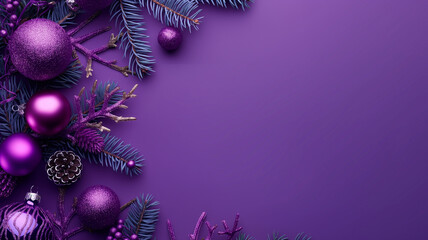 A purple christmas ornament hanging from a pine branch against a purple background scene