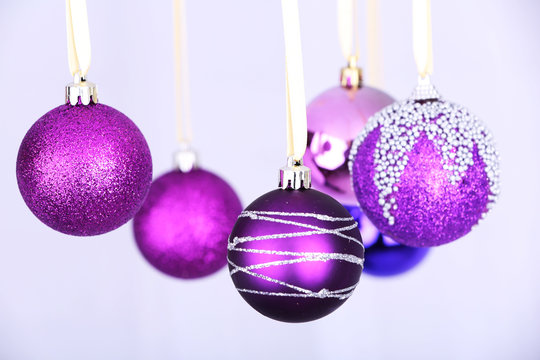 Purple Christmas balls lie on the background of garland lights. New Year's background