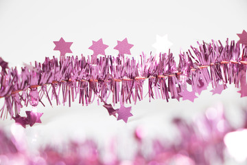 purple christmas tinsel or garland with stars at white background