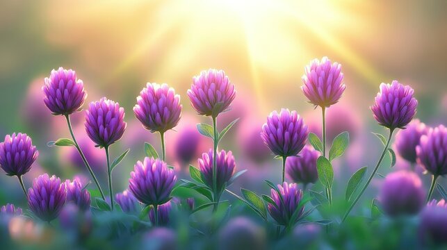 Bright sunny meadow filled with blooming purple clover flowers surrounded by green leaves with a soft bokeh effect and gentle sunlight shining through.