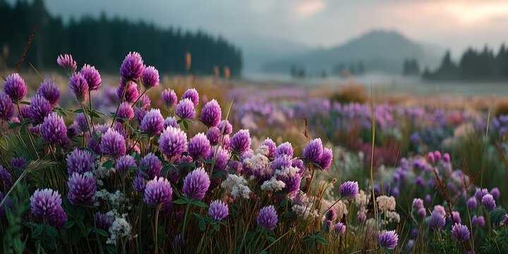 a vibrant field of purple clover blooms basks in the warm glow of a setting sun, creating a dreamy and idyllic landscape.