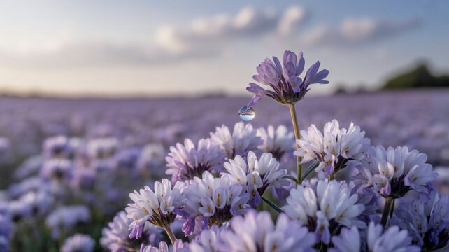 Close up view of delicate purple clover flowers blooming vibrantly in a vast field under a soft cloudy sky at dusk