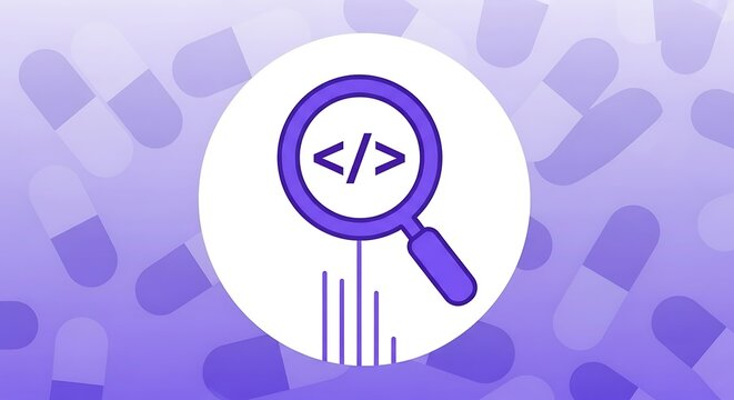Purple Code Magnifying Glass on White Circle Background