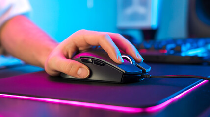A persons hand is shown resting on a computer mouse, which is connected to a computer. The room is lit with blue and purple hues, creating a dramatic and colorful effect
