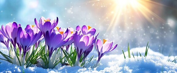 A beautiful spring background with purple crocuses growing in the grass and snow on a sunny day