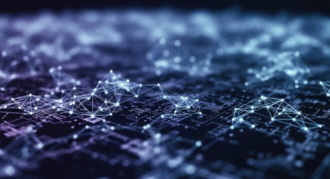 Neon blue and purple glowing lines create an abstract network pattern, showcasing futuristic design and technology concepts against a dark, blurred background with bright illumination.