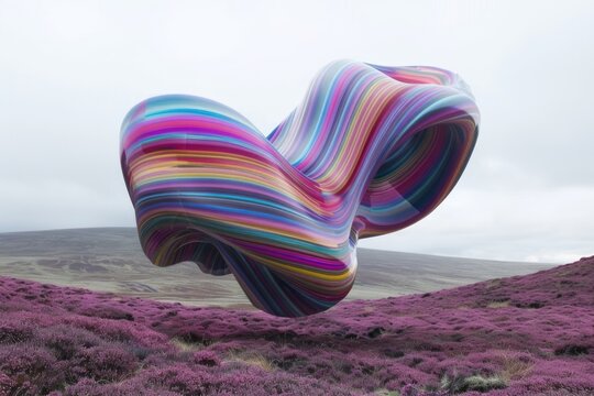 image of abstract multicoloured twisted shape levitating over landscape covered purple grass.