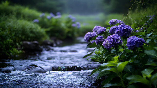 A gentle stream flowing through a field of purple hydrangeas.