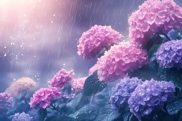 Romantic depiction of pink and purple hydrangeas with raindrops, surrounded by a dreamy, misty sky.