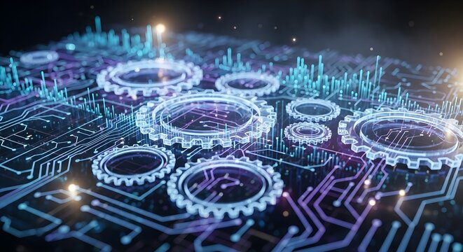 Blue and purple network glows, featuring circuit boards and gears for tech branding, video backgrounds.