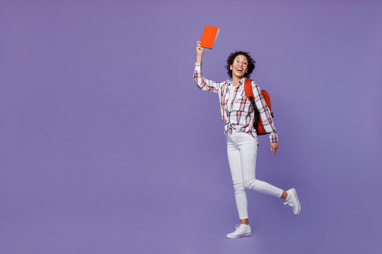 Full body excited happy young girl woman of African American ethnicity teen student in shirt hold backpack jump high hurry up run fast isolated on plain purple background Education in college concept