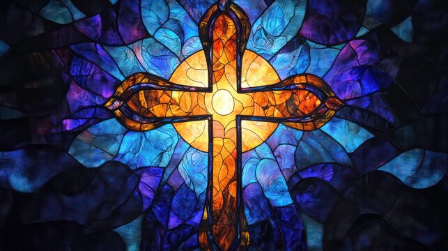 Stained glass depiction of a cross, centered with radiant light and intricate blue and purple patterns, embodying faith.