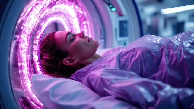 An individual undergoing a state-of-the-art MRI scan in a modern medical facility with vibrant purple lights of the MRI machine illuminating the room providing a futuristic look.