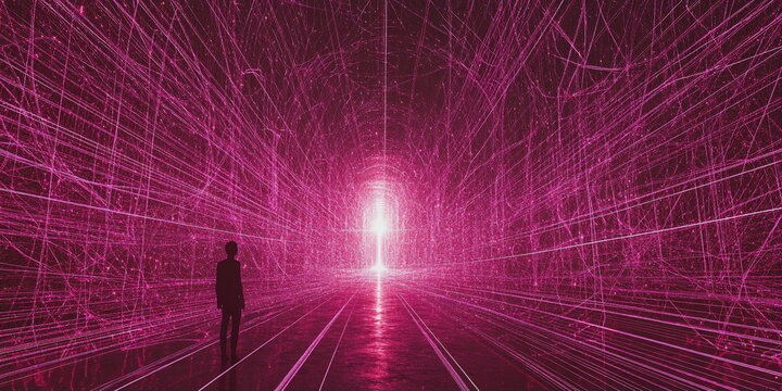 Digital barcode displaying product information, being scanned by a futuristic laser light beam, creating a dynamic visual of data processing and modern technology