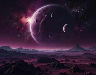 Glowing purple-pink planet with orbiting rings and stars futuristic cosmic illustration