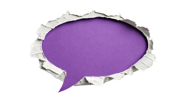 Digital illustration of a purple speech bubble with a textured, torn paper effect.