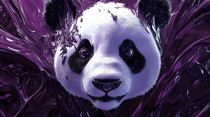 Panda face surrounded by vibrant purple splash and detailed fur texture, showcasing digital artistry and high-resolution rendering