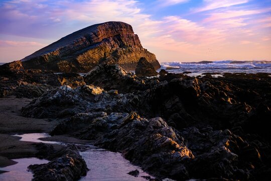 Beautiful rocky shore of the sea during purple sunset
