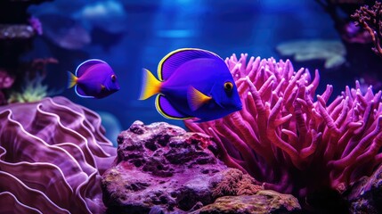 Vibrant purple tang swimming among coral reefs
