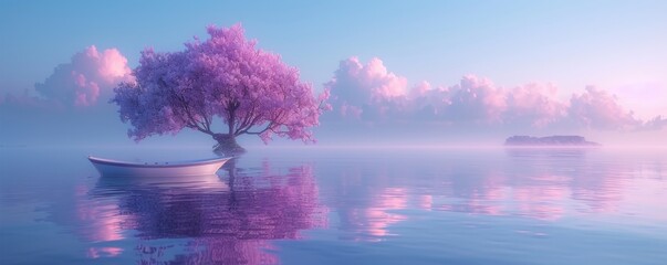 Tranquil scene with solitary purple tree and boat on calm water at sunrise