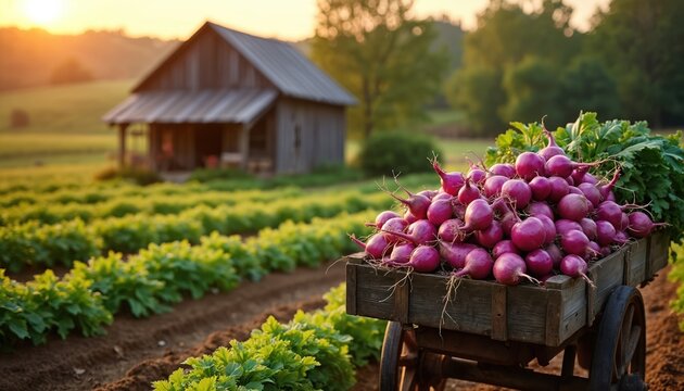 Vibrant purple turnips fill wooden cart in rustic farm setting at sunset. Rows of green plants stretch across field towards distant barn. Fresh produce, healthy food, countryside farming themes