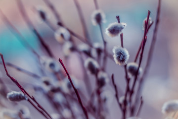 Magically beautiful Japanese willow ornamental trees in a summer garden in the Midwest, with purple and pink petunias, garden containers, catmint and red roses.