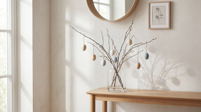 Easter branch with hanging pastel eggs in glass vase on wooden table. Spring holiday decoration for home interior. Festive seasonal ornament and renewal concept.
