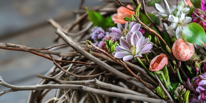 Delicate willow branches adorned with vibrant, hand-decorated eggs, creating a festive spring display. Symbolizes renewal and joy ,indoor ,home ,pink