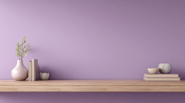 A realistic Zoom background with a lavender-colored wall and a simple, modern bookshelf.